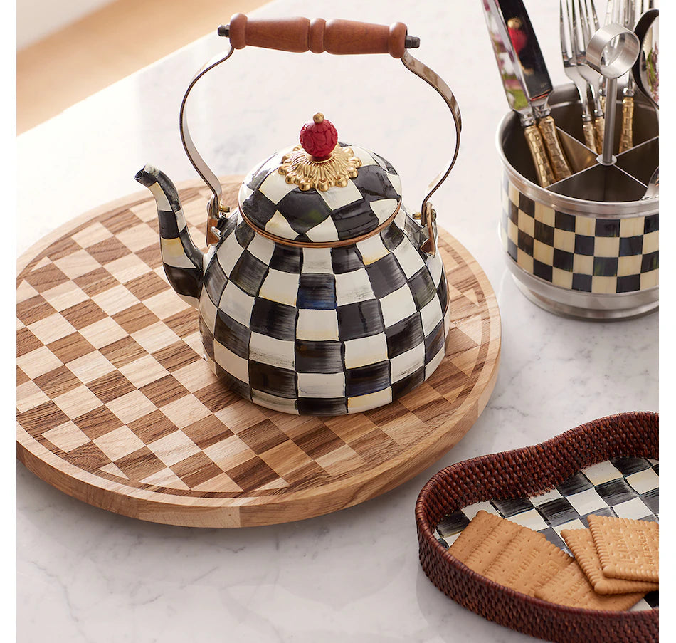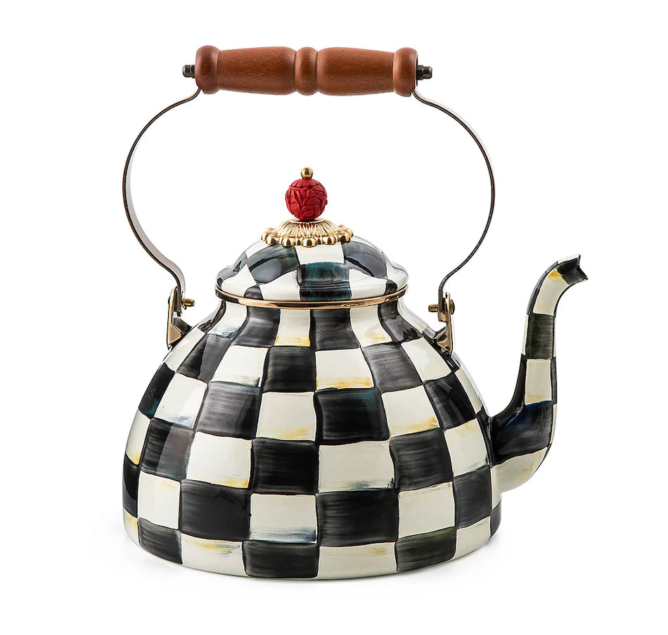 This is the famed black and white checked tea kettle. Bubbling over with MacKenzie-Childs style, the Courtly Check® Enamel 2-Quart Tea Kettle will have you finding new reasons to put the kettle on to boil. The heavy-gauge steel underbody is hand-painted with our color-dragged Courtly Checks® and ceramic glaze, and rimmed in bronzed stainless steel.