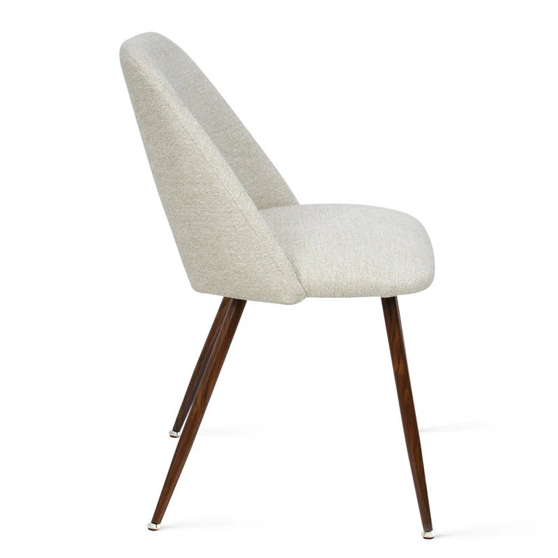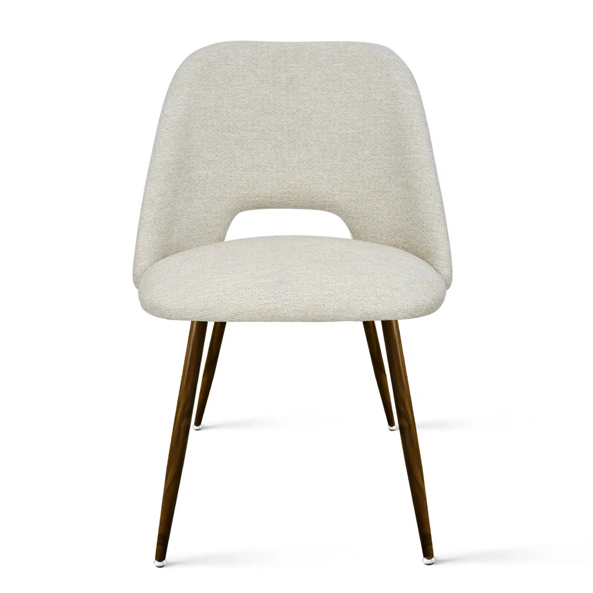 This 4-piece dining chair set brings modern sophistication to your dining area with its sleek lines and walnut leg colour. The steel legs provide ample support, while the polyester blend upholstery offers a comfortable and stylish seating experience. Each chair is filled with foam, ensuring a cozy place to enjoy meals with family and friends. We love that the solid back design and plastic glides on the feet make these chairs a practical addition to your dining space. With a weight capacity of 250 lbs., these chairs are a versatile choice for both everyday use and special occasions.