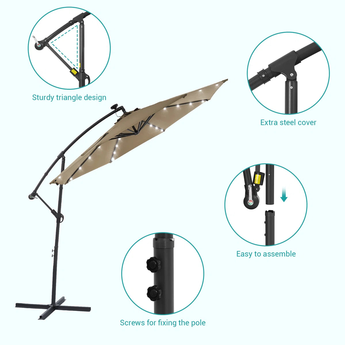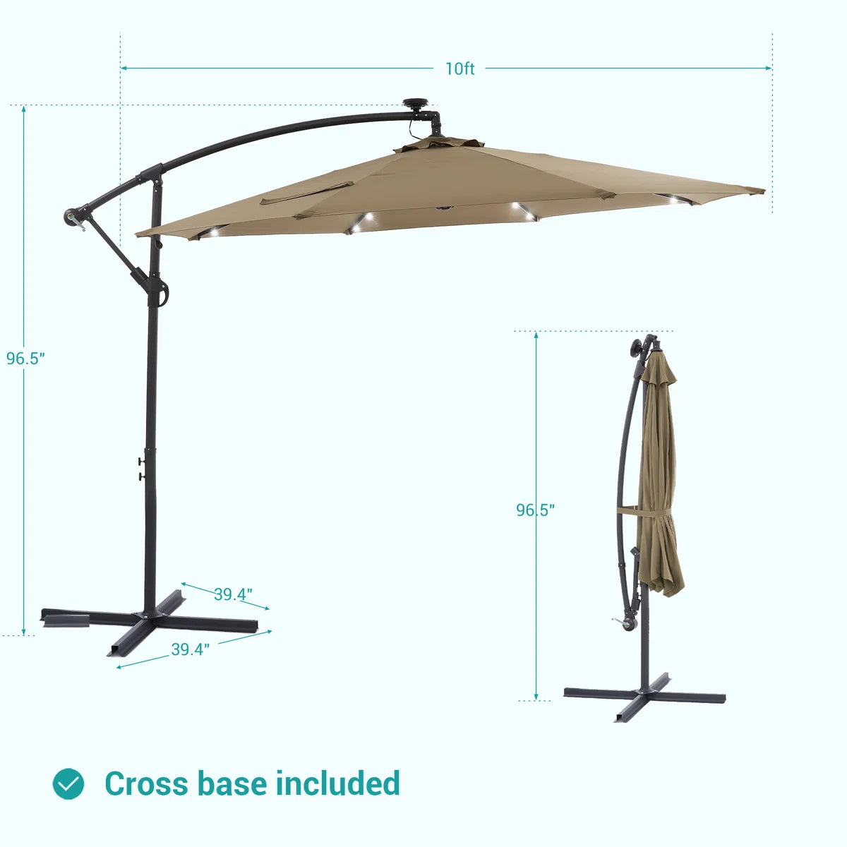 With a UPF of 50+, this outdoor patio umbrella can protect your skin from sunburn even in the hot summer. This larger-sized patio offset umbrella stretches a full 10 feet when opened, giving you complete shade all around - and because there's no pole in the middle, your shady spot will never be split in two. While having LED patio umbrella lights lets you enjoy the outdoors even after sundown. It is also the best way to avoid expensive investments in pricey standalone lamps or wall sconces. Installed on the ribs of the patio umbrella. Apart from being practical, they are a decorative option to illuminate the space.