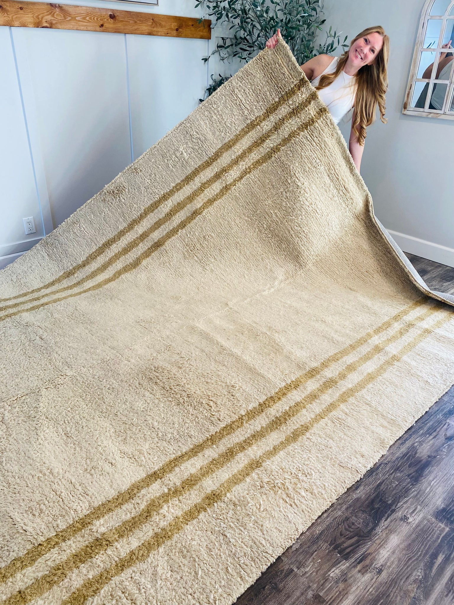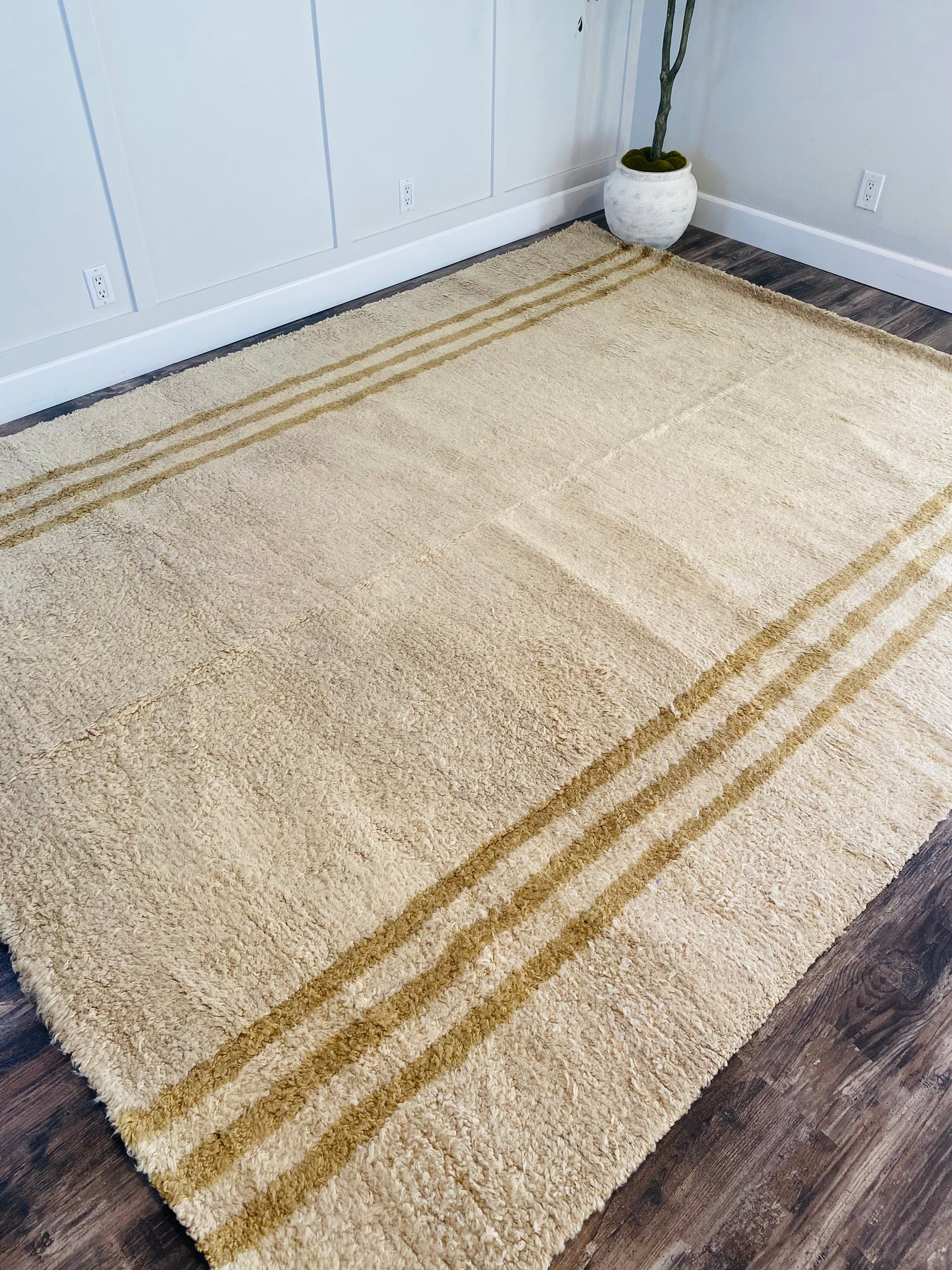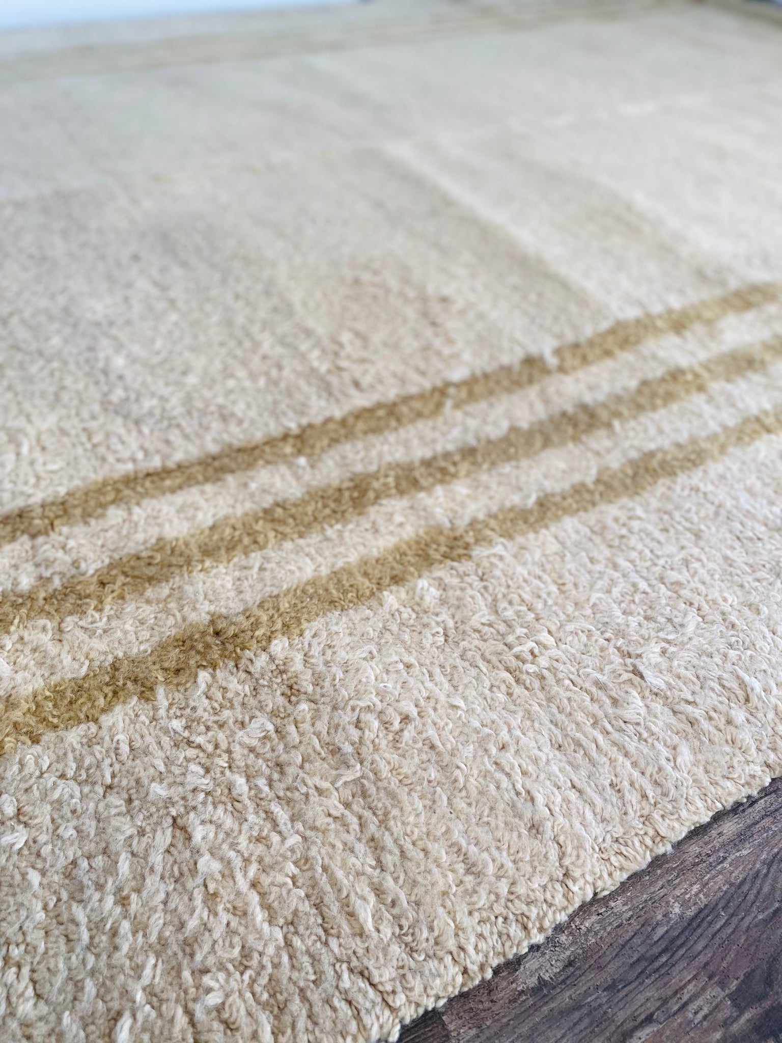Plush and cozy. This hand-tufted wool area rug features a minimal stripe motif in a warm tan hue, adding a touch of texture and comfort to your space. The high-low pile creates a soft, inviting surface for your feet, while the non-slip backing ensures stability. Designed for indoor use, this shag rug is a perfect addition to any room in need of a little extra warmth. Plus, it's backed by a canvas material for added durability. We recommend pairing this area rug with a rug pad to keep it in place.