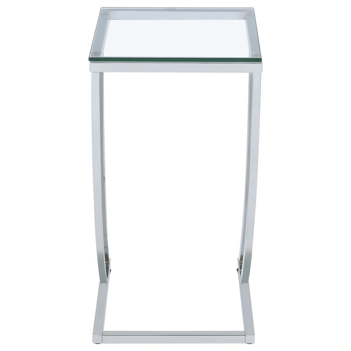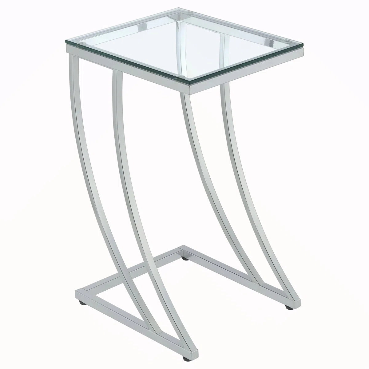 Grace your living space with the chic, modern style of this gorgeous, metal and glass accent table. Featuring a clear tempered glass top, this table sits atop sleek, curved supports with an angular base for an intriguing look.