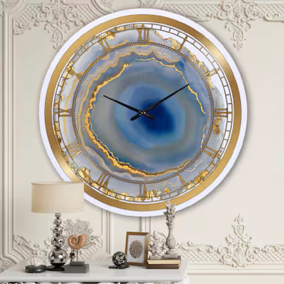 This attention-grabbing wall clock makes a statement wherever you place it in your home with its water agate face and contrasting black metal hands. The round aluminum frame features a beaded border beneath the Roman numerals, adding an extra layer of sophistication to the piece. Gold-toned accenting enhances its overall design to become the focal point of any room. This clock operates on a single AA battery (included) and arrives ready to hang with mounting brackets on the back.