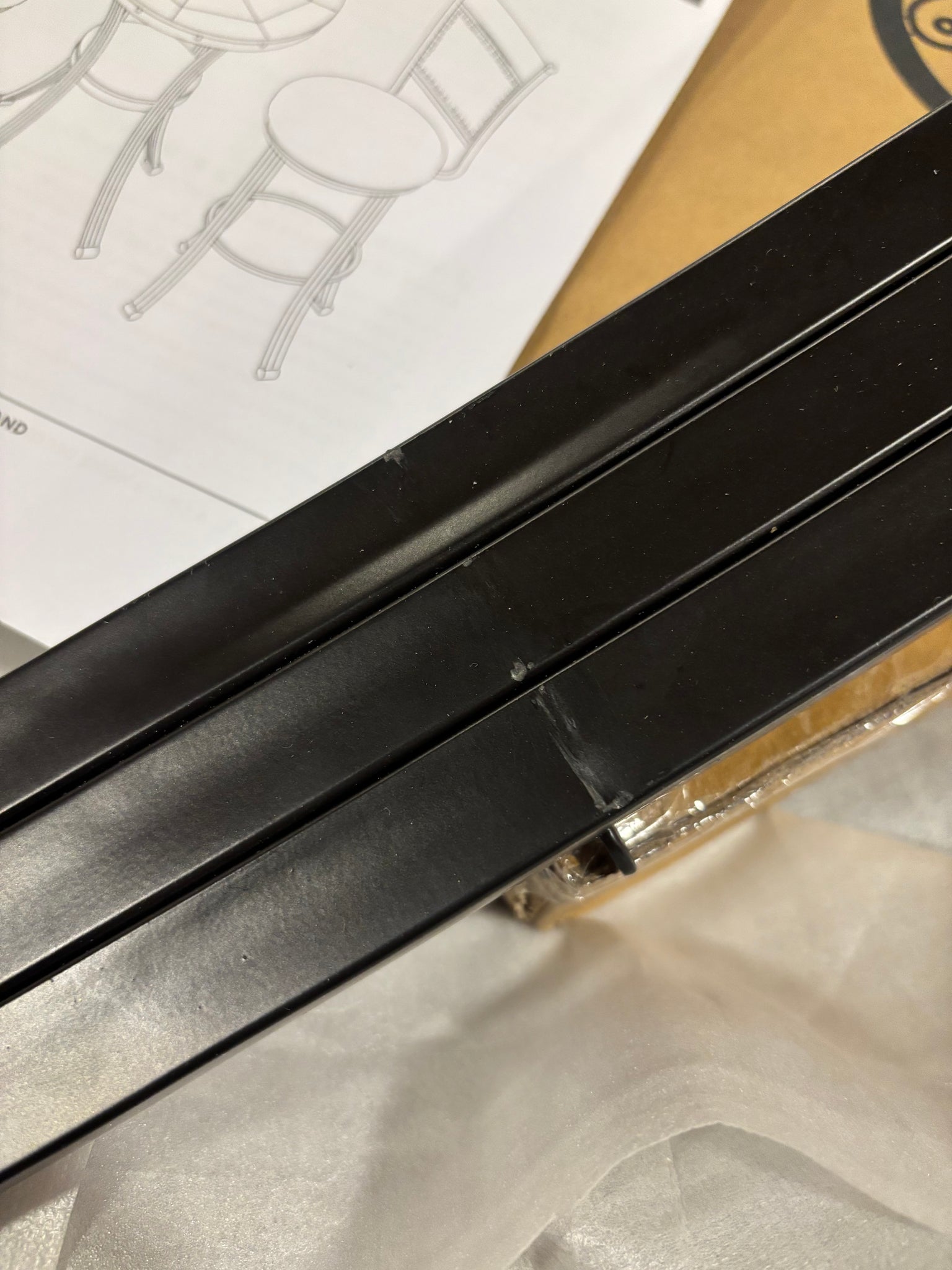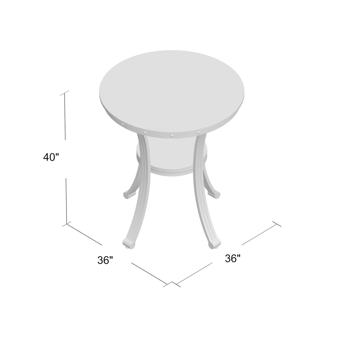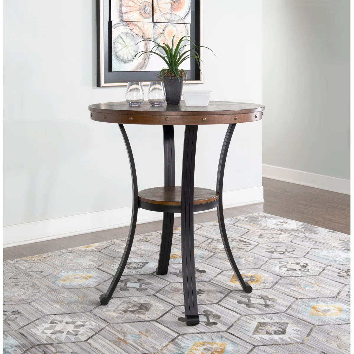 Mixing metal with wood, this transitional pub table provides a unique addition to your home. The round pub table features an oak wood grain veneer with nailheads along the apron. The sturdy metal base is made of curved legs and includes a small circular shelf.