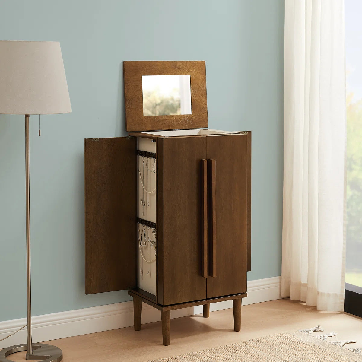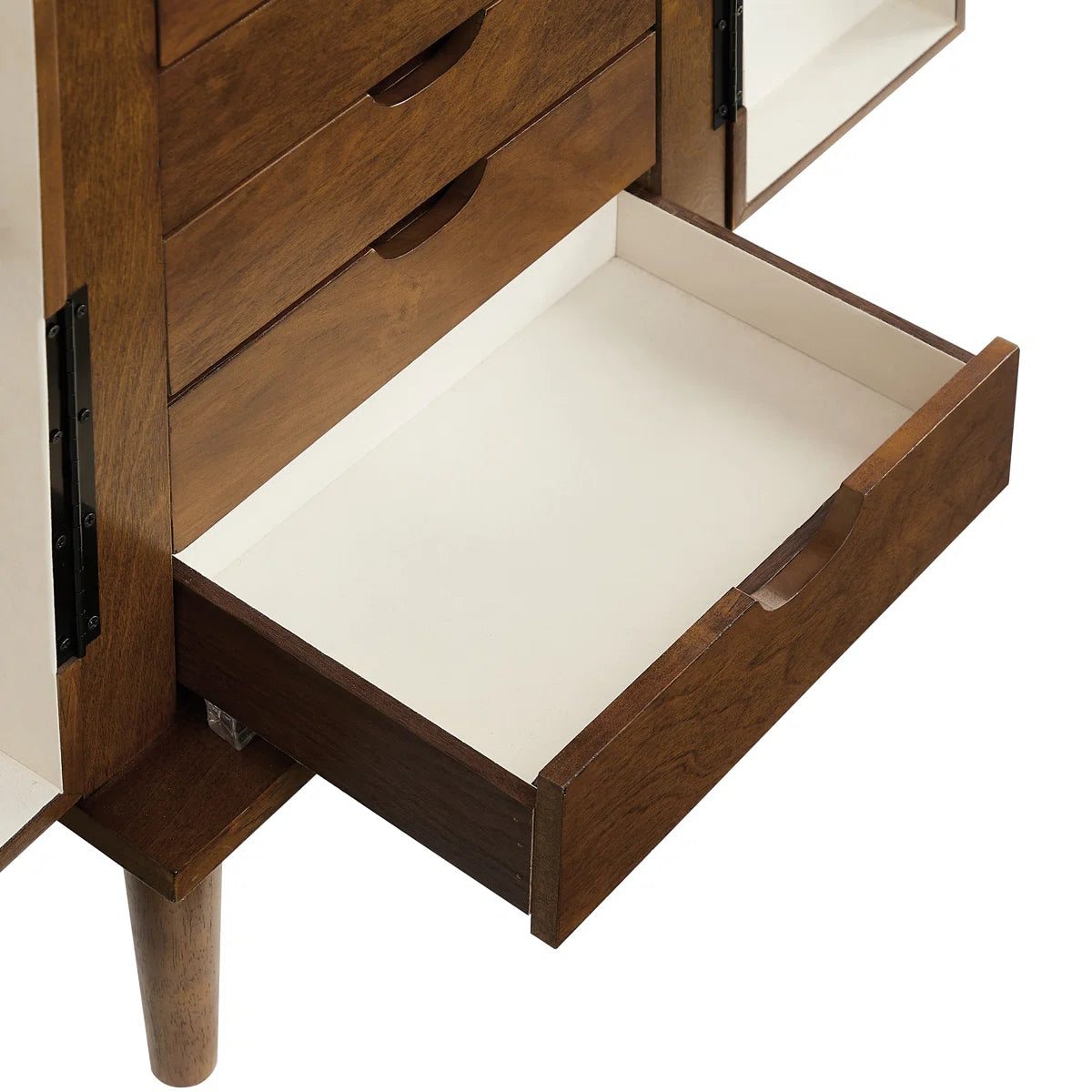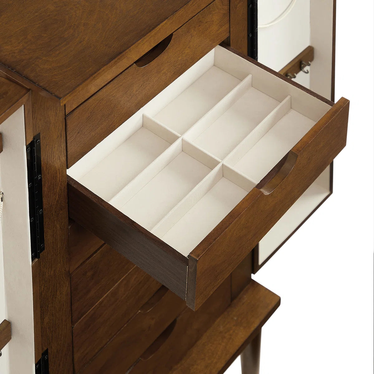 Experience a new level of jewellery organization and display with this exceptional armoire. Explore a myriad of possibilities as the side panels unfold, revealing two rows of hooks for elegantly hanging your chains and bracelets on both sides. Unlock the hidden surprises further by lifting the top panel, which transforms into a secure vanity mirror overseeing a concealed storage compartment. Discover the additional hanging displays within the centre doors, encircling a row of seven drawers, each thoughtfully lined with cream felt to safeguard your treasured pieces. Despite its multifaceted design, this armoire remains unassuming when closed, with its compact walnut frame serving as a versatile and indispensable asset for your collection.