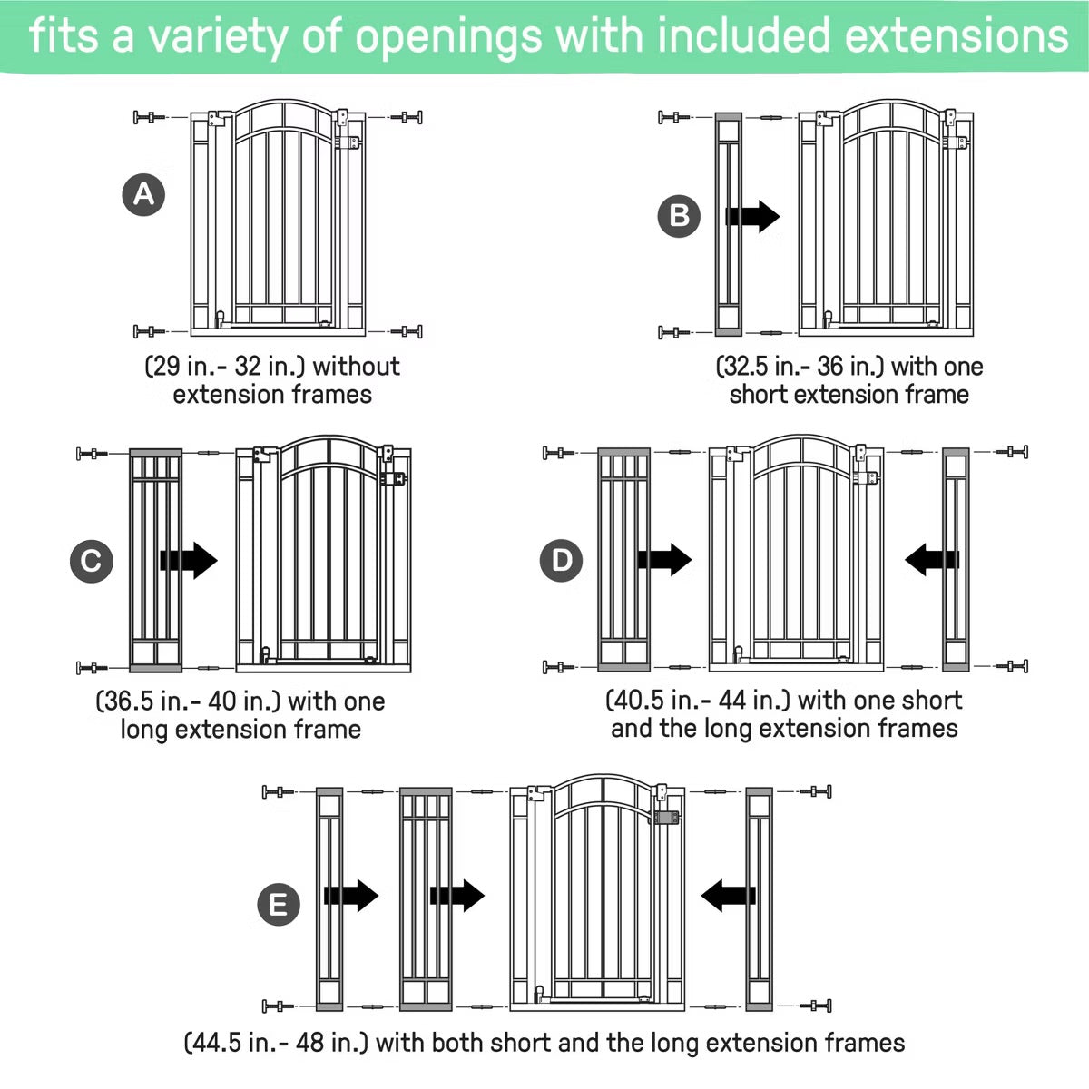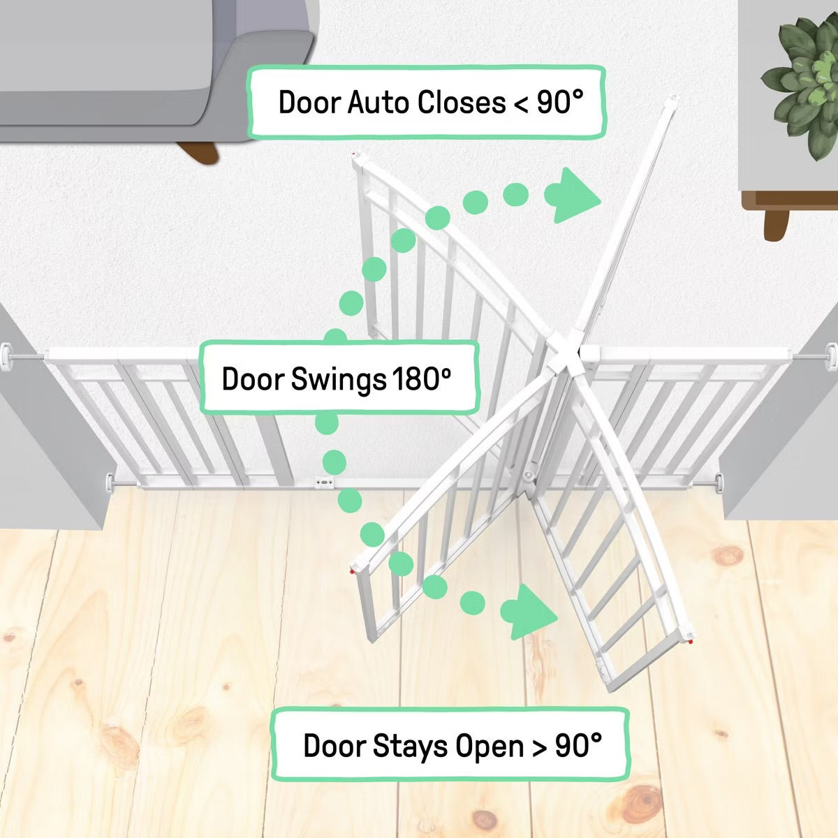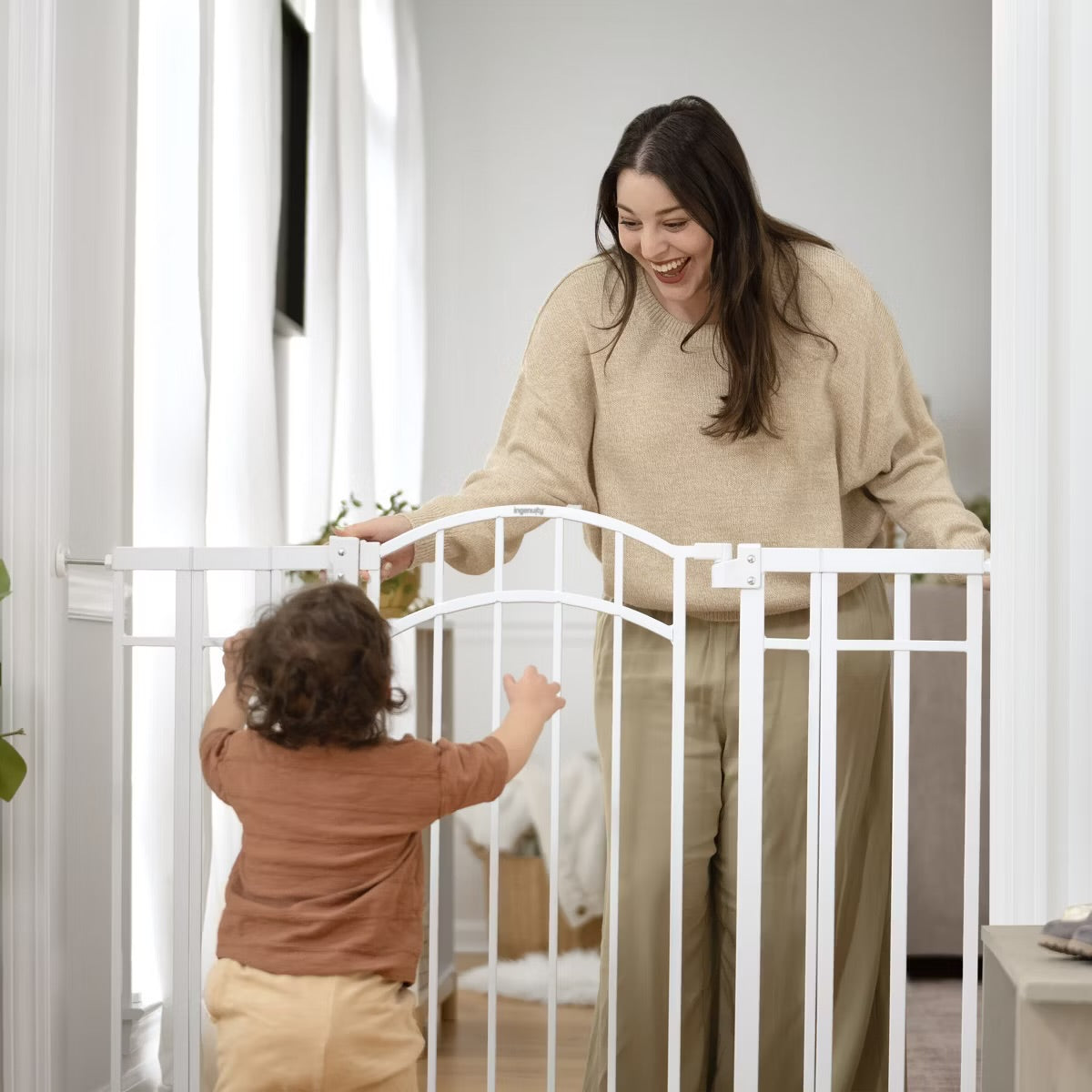 Keep your loved ones safe & secure in style with the Ingenuity Doorway 48W Series Pet and Baby Gate. Measuring 36" tall (including a decorative arch), this white metal safety gate conveniently helps contain children and pets while complementing your home dcor. Our Hold-Open and Auto-Close technologies add convenience as you navigate your home. When opened more than 90 degrees, the door will stay open. When engaged less than 90 degrees, the door will close. A variety of included extensions help you configure the ideal setup for spaces from 28.5 to 48 inches wide. Install it in doorways or hallways quickly & easily using the included no-drill pressure mount system with adhesive wall cups that help protect your walls from damage. Or use it at the top of the stairs with included hardware (required for safe stairway installation). Recommended tools for hardware installation (not included): drill, Phillips-head screwdriver, pencil, measuring tape. NOTE: When installing the gate, do not cut the red zip that is tightened around the swing door until instructed to do so in the Instruction Manual.