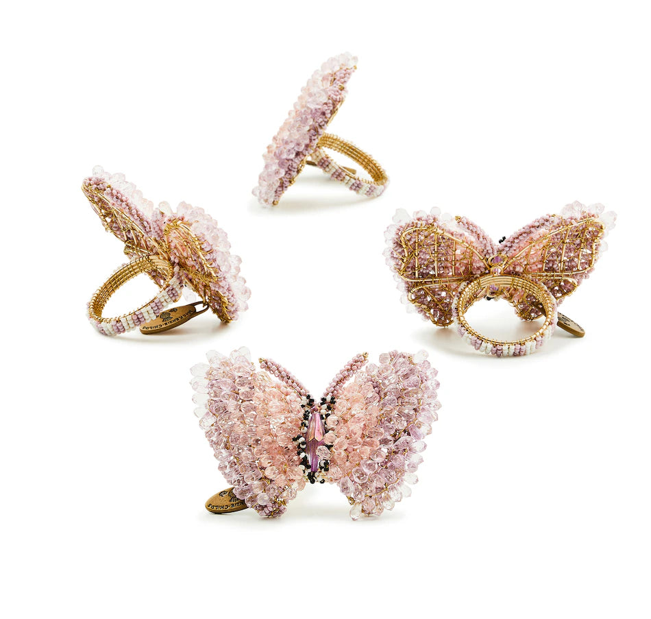 What could possibly help usher in spring more than these four pink butterfly napkin rings, which add the jewelled touch of MacKenzie-Childs to your table settings. Each ring features beads and sequins on a frame of iron and brass, with a band of pink and cream beads wrapping around the napkin.