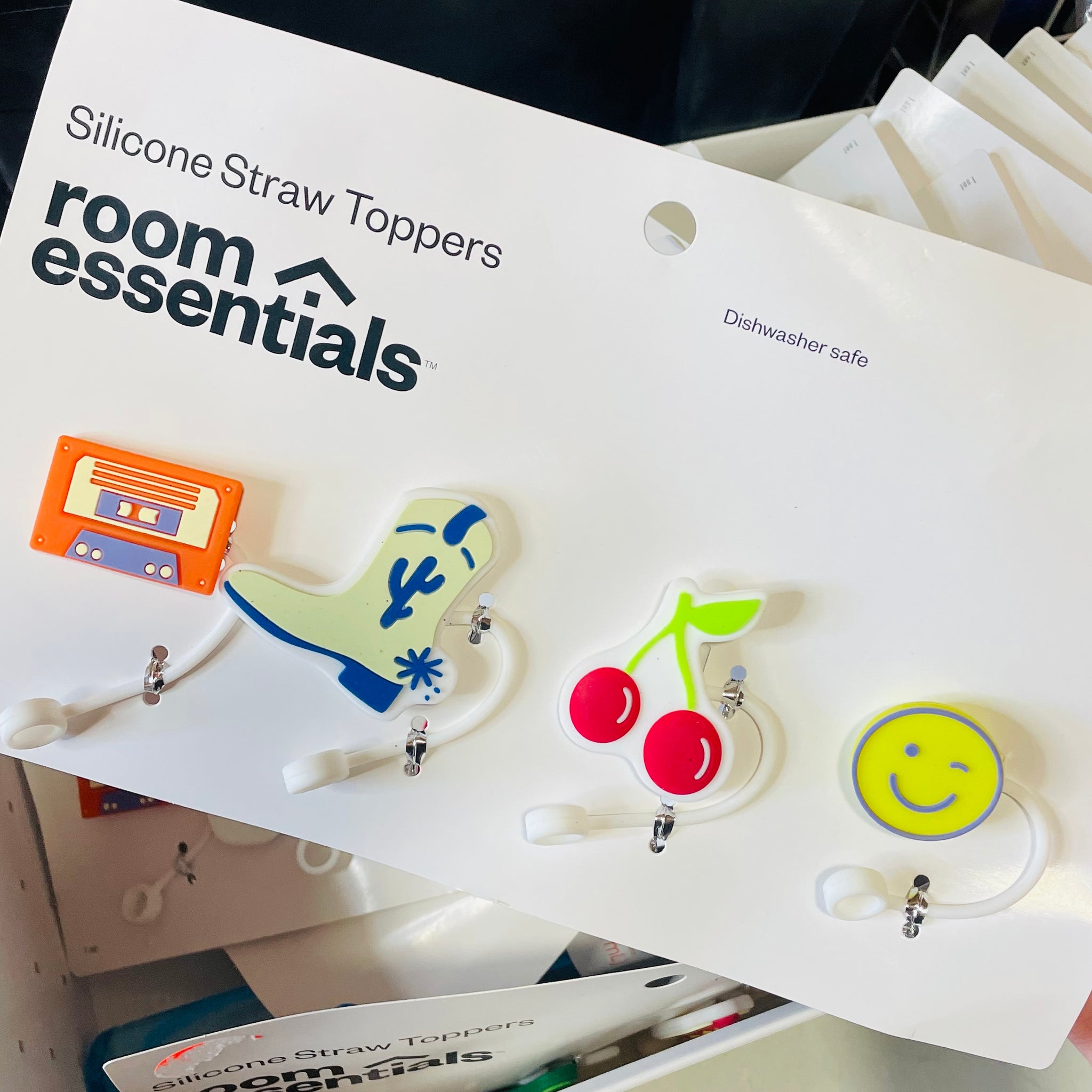 Add a fun, colorful touch to your favorite tumbler! This adorable set of 4 silicone straw toppers from Room Essentials™ includes playful designs like a retro cassette tape, cowboy boot, bright cherries, and a smiley face—perfect for personalizing your drink and keeping track of your straw.