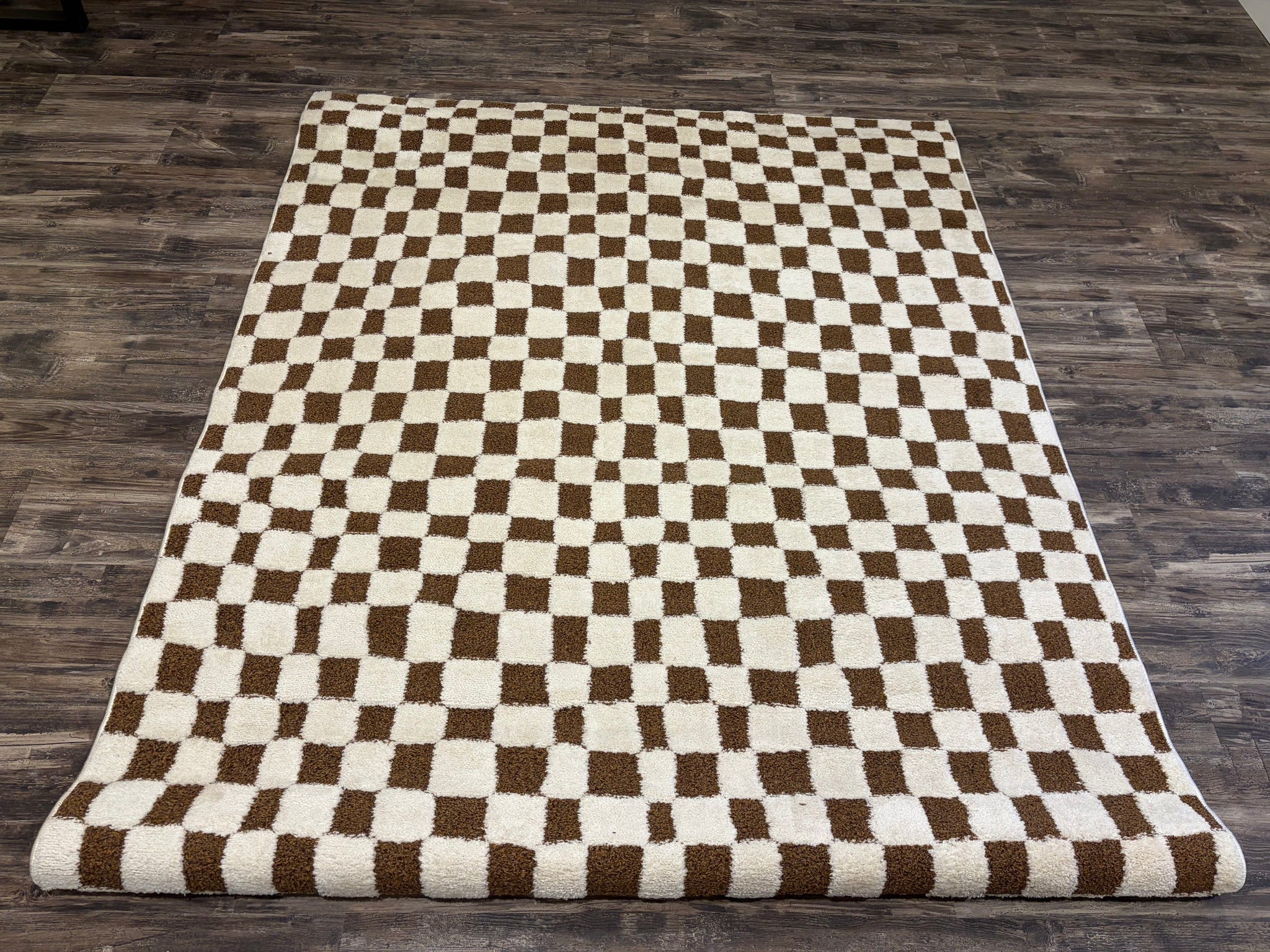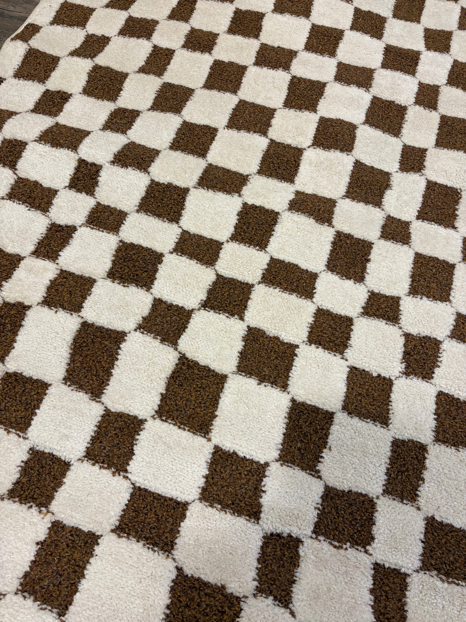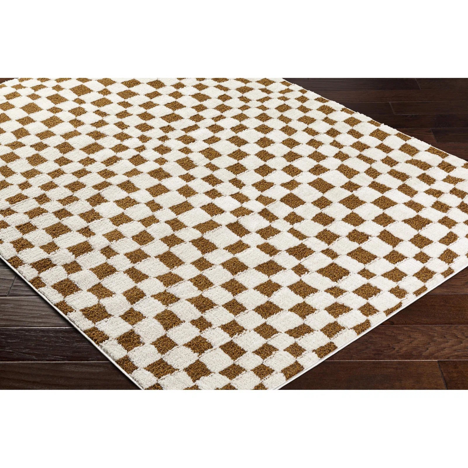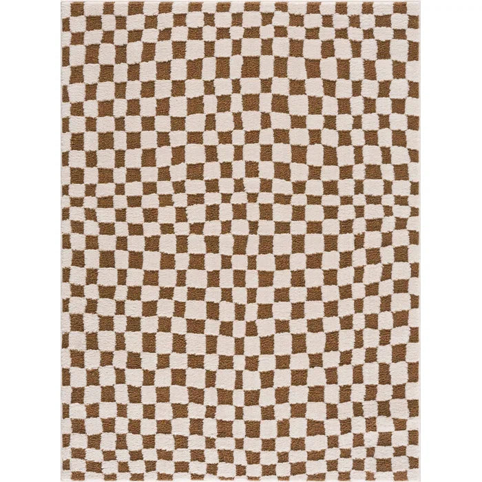Lay a modern foundation in your living room or den with this area rug. Its eclectic checkered pattern shows off asymmetrical color-blocking in brown and ivory hues for a monochromic feel. Power-loomed from polyester, it shows off a medium 0.55'' pile that makes it a great fit in rooms that see limited foot traffic, where it warms and cushions your floors. Plus, it's safe to place on heated floors, and it's stain-resistant, so it fits well in homes with pets and kids. We recommend adding a rug pad underneath to keep it in place.
