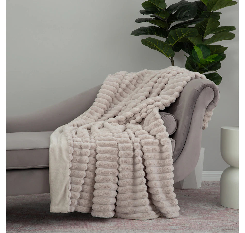 Lounge in luxury with this decadent faux-fur jacquard stripe throw! Manufactured from two of Berkshire Blanket's best selling fabrics, Grace Fur and Velvetsoft, this oversized throw is crafted with high-end materials that offer a silky-soft hand-feel and make you feel like royalty. It also has a beautiful striped texture that gives it some added dimension. Snuggle up to this soft and luxurious throw from Berkshire Blanket, available at a great value through TSC!