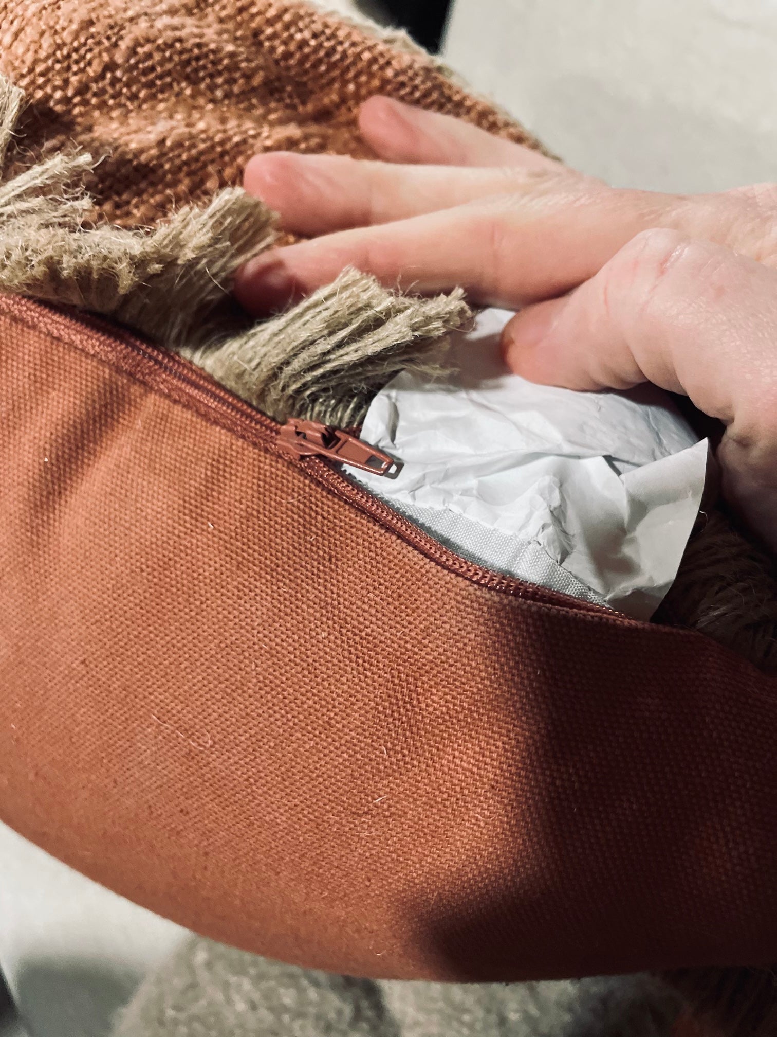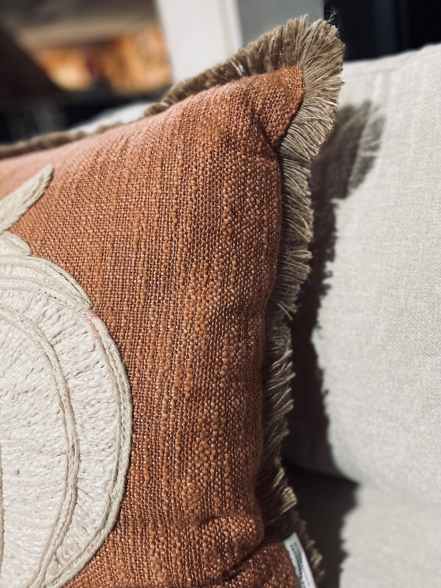 incredibly gorgeous texture, design and detail. Fringe edge and embroidered pumpkin. Orange, brown, cream