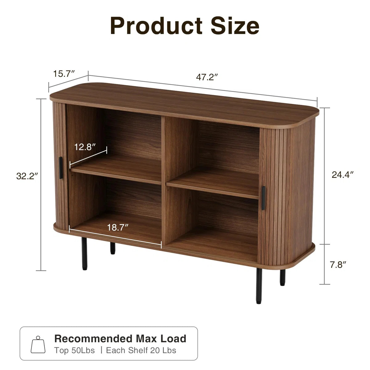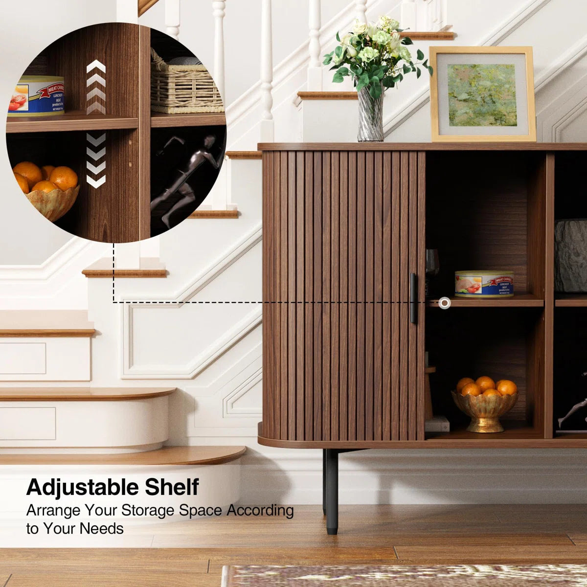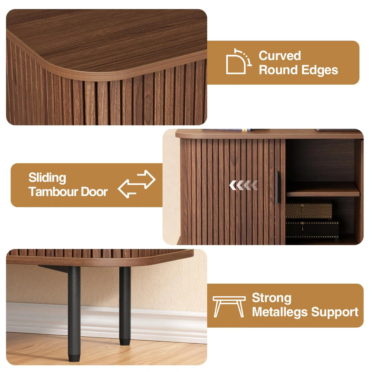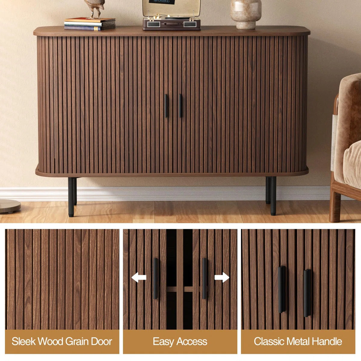 【Modern Mid-Century Style】: This sideboard features an oval walnut grain panel, sliding roller shutter doors and rustic black handles. The roller shutter sideboard is designed to be both beautiful and practical. It makes efficient use of built-in storage space, ensuring that the stored items are not exposed. In addition, you can use it as a coffee table or wine table. Whether placed in the living room, foyer or office, the arched groove cabinet will add charm to your home.