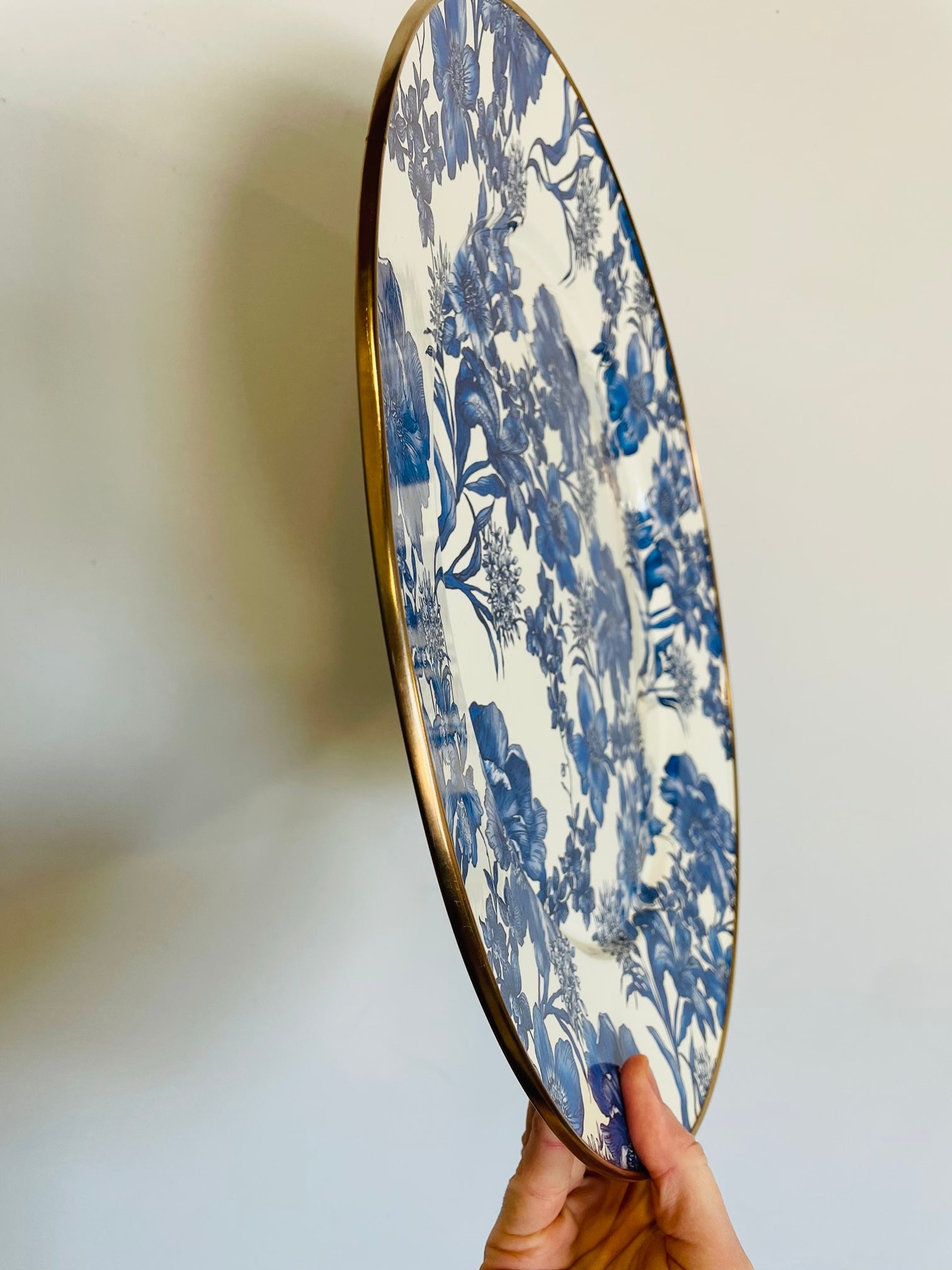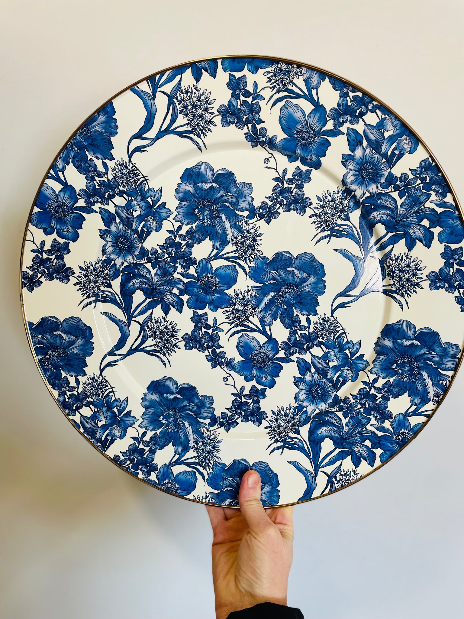 Serve your favourite dishes in style with this blue floral enamel serving platter. The heavy-gauge steel underbody is glazed with hand-applied transfers and rimmed in bronzed stainless steel.