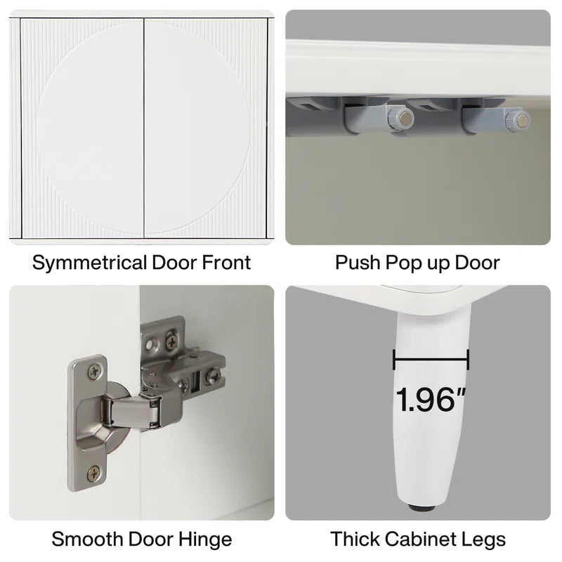 Constructed from engineered wood, its frame boasts four cabinet doors adorned with symmetrical semicircle pattern door front, chic and stylish.