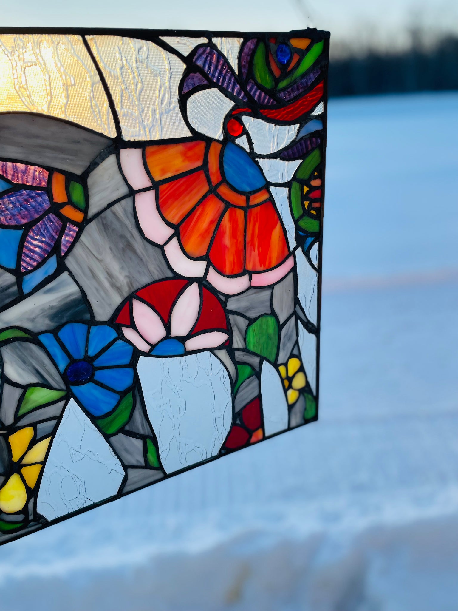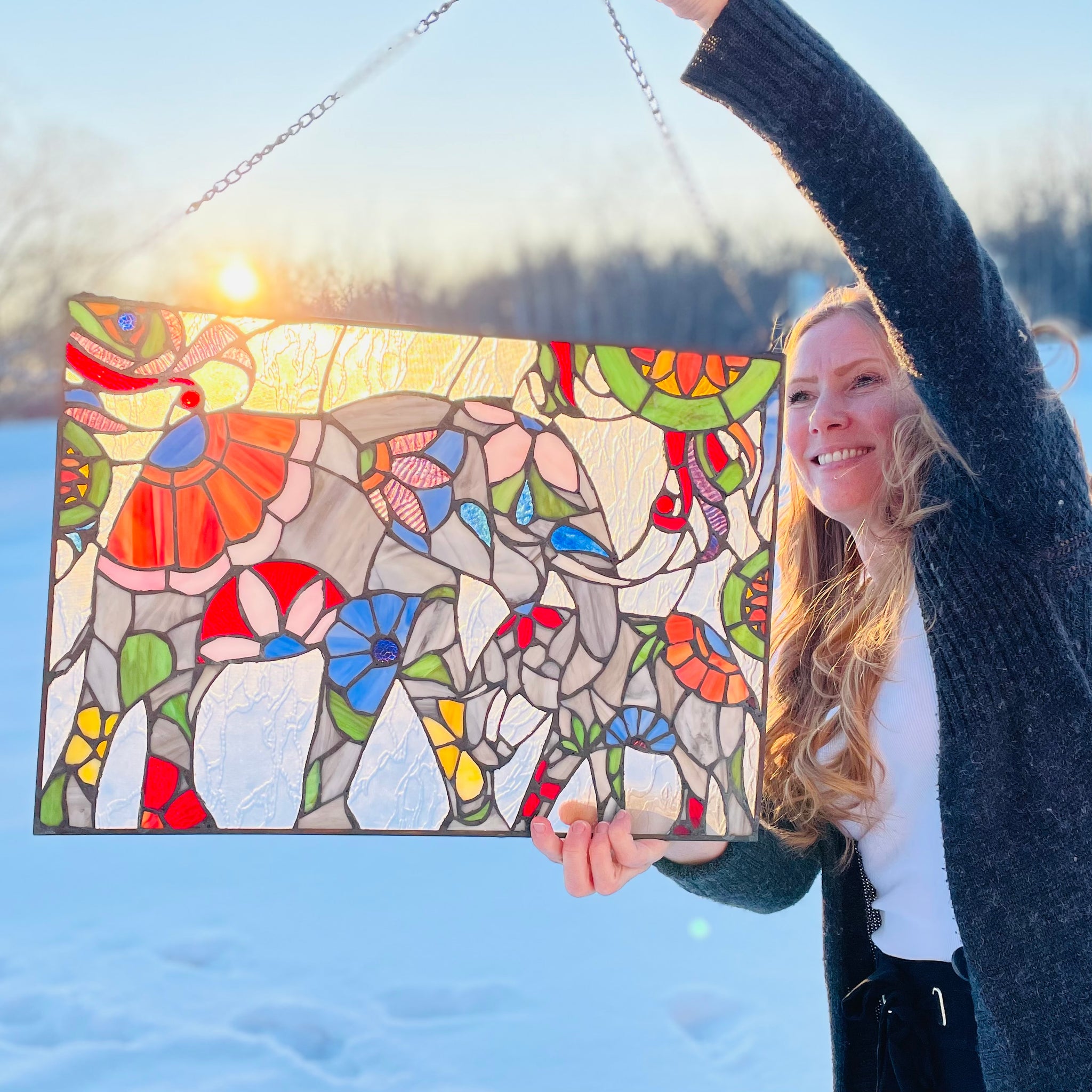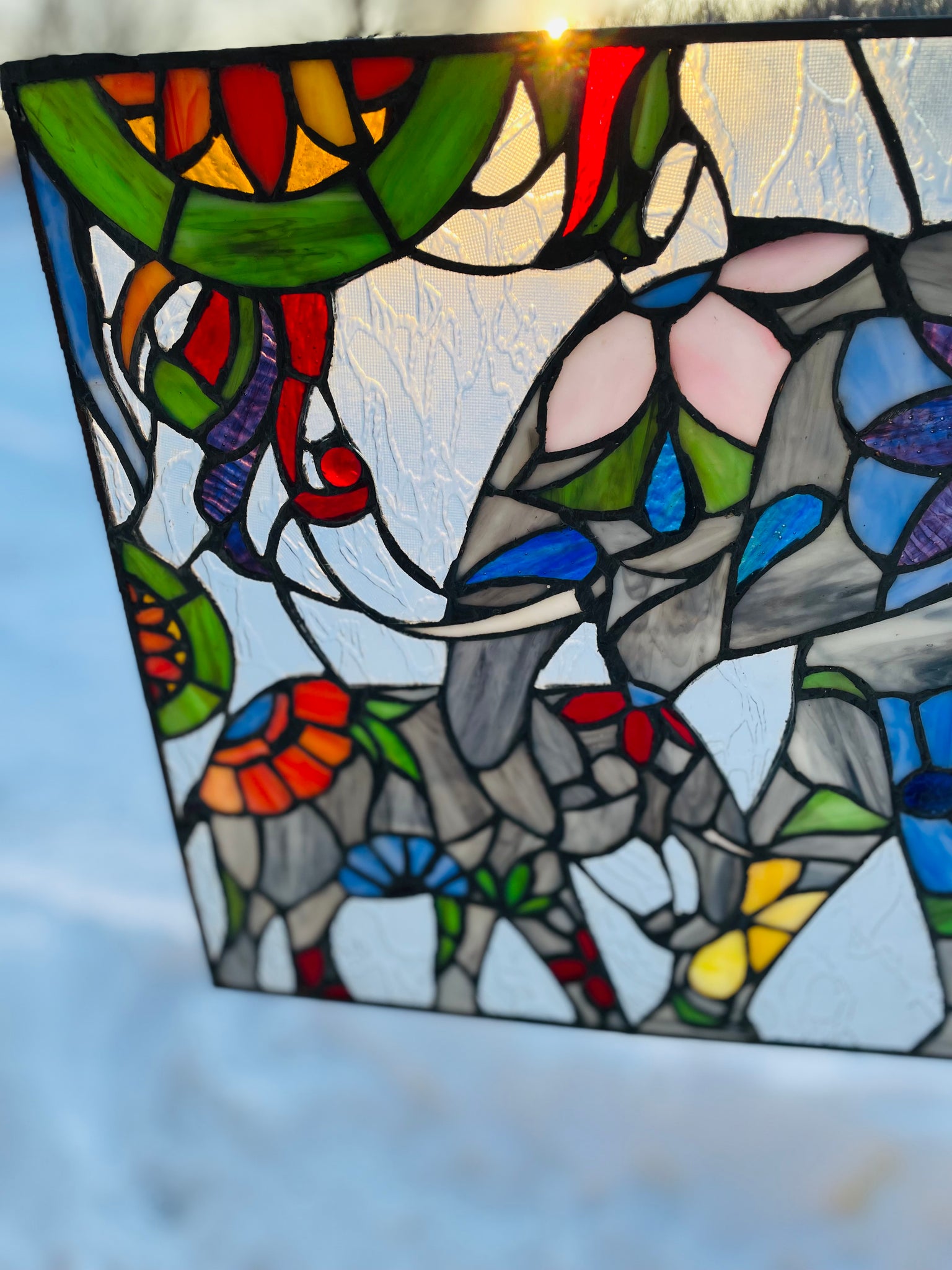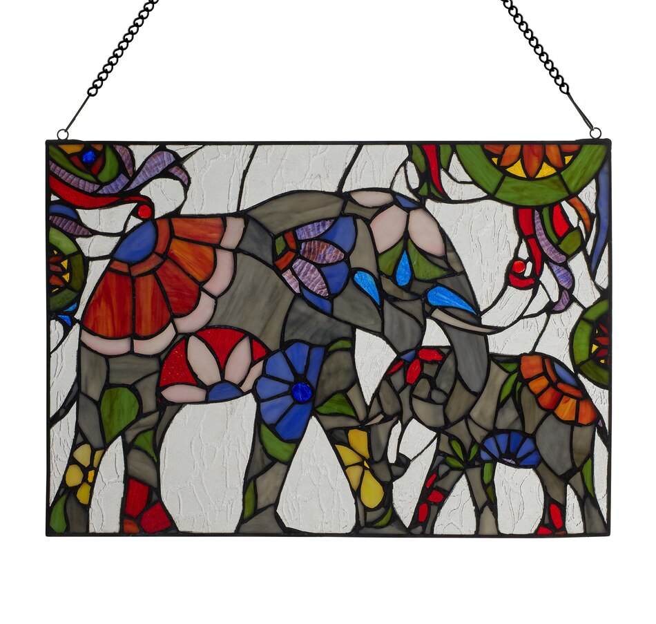 This striking window panel depicts a grey mother and baby elephant with a colourful flower pattern. Its eclectic style brings a colourful work of art to your home.