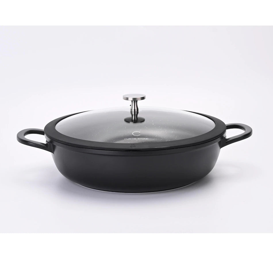 Curtis' do-it-all pan lives up to its name, providing the ultimate cooking vessel for an impressive array of favorite home-cooked meals. Making a beautiful transition from the stovetop or oven to your dining table, this ultra-versatile pan is great for everything from slow-simmering soups, stews, and chili to braising meats, poultry, and vegetables. The glass lid fits snugly to retain heat and moisture while allowing you to monitor food. Or use it without the lid for stir-frying, deep-frying, sauteing, or baking casseroles.