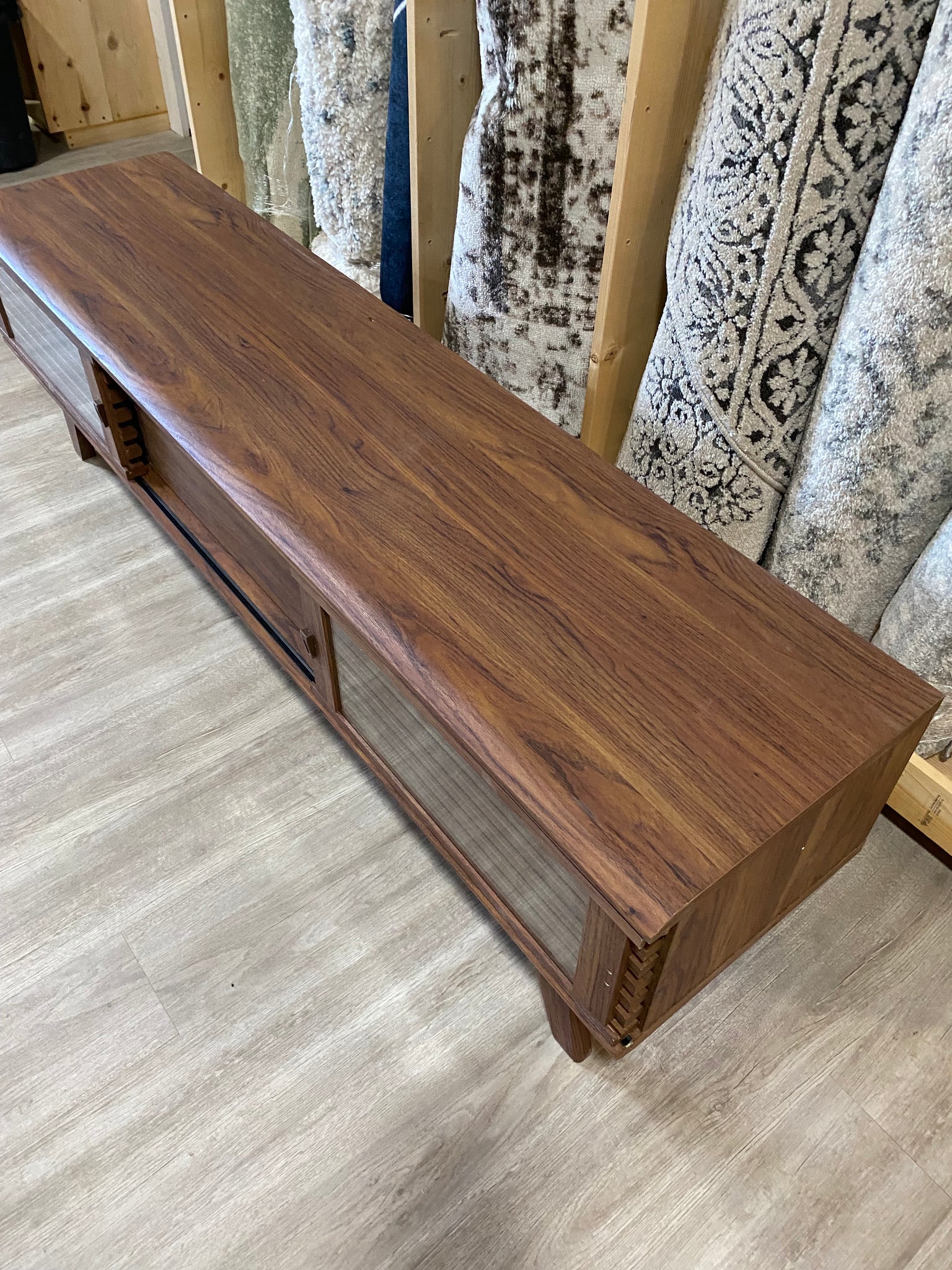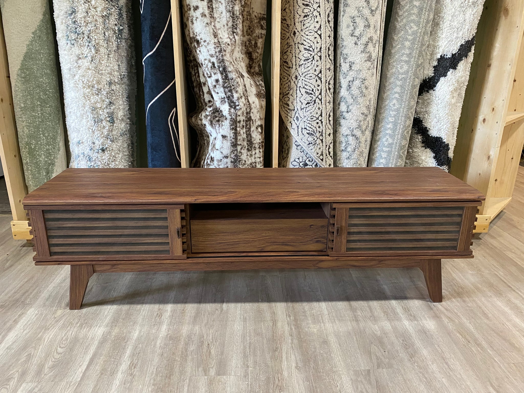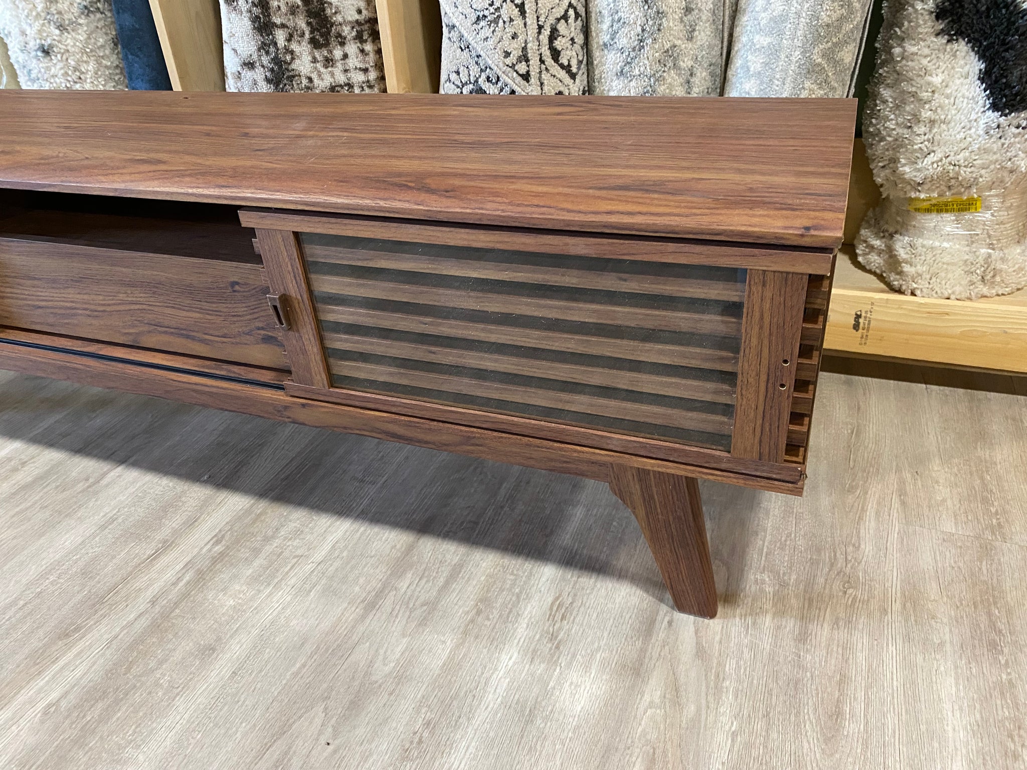 - SUPERIOR CONSTRUCTION - Sitting atop tapered legs, this vintage media console features a particleboard frame with walnut grain laminate. Includes cable management for keeping your visual space clean