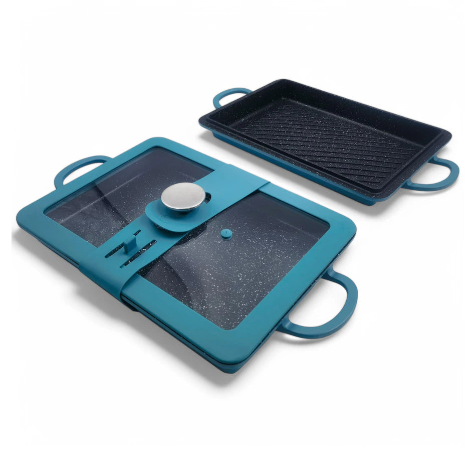 Add a multitude of delicious possibilities to your kitchen with this baker griddle and grill set from Curtis Stone. It's crafted from cast aluminum with stainless steel rectangular base which provides even heating across all pan surfaces, and the specially formulated five-layer diamond non-stick coating adds strength and durability. The tempered glass lid has a silicone rim and allows you to keep an eye on your food without losing moisture, and the silicone pot lid holder lets you cook at home and carry to your next party with ease. The pan is also oven safe up to 450°F (the lid up to 400°F), safe for use with metal utensils, and works with all stovetops, including induction. Easy to use and maintain, this baker griddle and grill is a great addition for both beginners and culinary experts alike, and it's available at a great value through TSC!