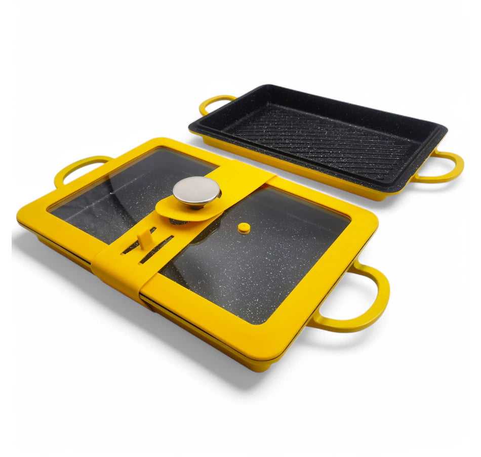 Add a multitude of delicious possibilities to your kitchen with this baker griddle and grill set from Curtis Stone. It's crafted from cast aluminum with stainless steel rectangular base which provides even heating across all pan surfaces, and the specially formulated five-layer diamond non-stick coating adds strength and durability. The tempered glass lid has a silicone rim and allows you to keep an eye on your food without losing moisture, and the silicone pot lid holder lets you cook at home and carry to your next party with ease. The pan is also oven safe up to 450°F (the lid up to 400°F), safe for use with metal utensils, and works with all stovetops, including induction. Easy to use and maintain, this baker griddle and grill is a great addition for both beginners and culinary experts alike, and it's available at a great value through TSC!