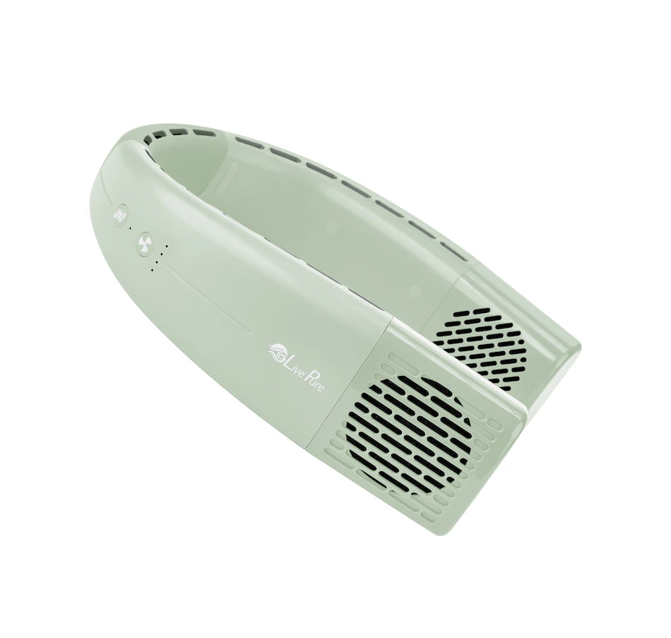 This portable, wearable fan/air cleaner has four convenient speeds (low, medium, high and turbo) and features four coconut carbon pre-filters, which trap larger airborne particles such as dust, pet hair and dander are trapped. Clean air is then circulated around you. The airflow is directed inward at the neck (an area that drives bodily heating/cooling) as opposed to, say, just blowing air past the eyes and drying them out.