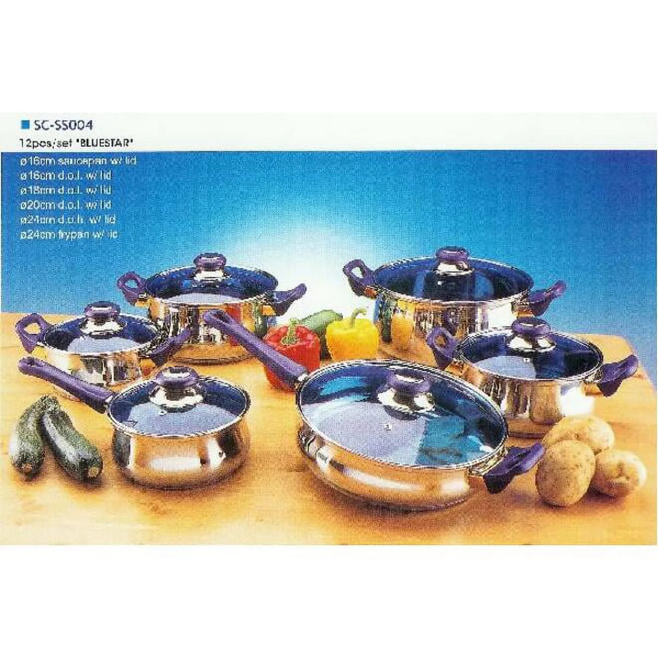 Gourmet Chef Cookware Set - 1.5 quart Saucepan, 1.5 quart Stockpot, 2 quart Stockpot, 3 quart Stockpot, 6.5 quart Stockpot, 10" Diameter Frying Pan, Lid - Stainless Steel, Aluminum Base, Glass Lid, Gold Plate