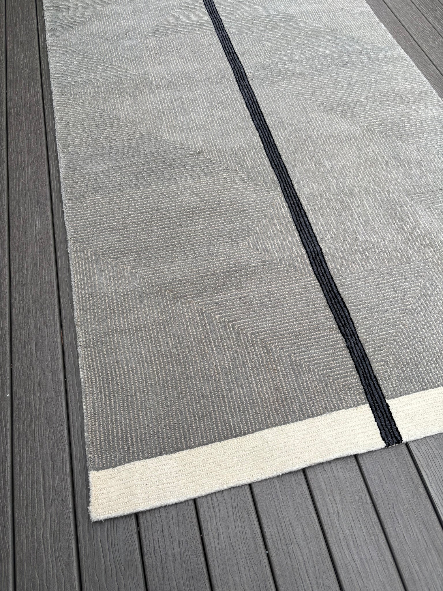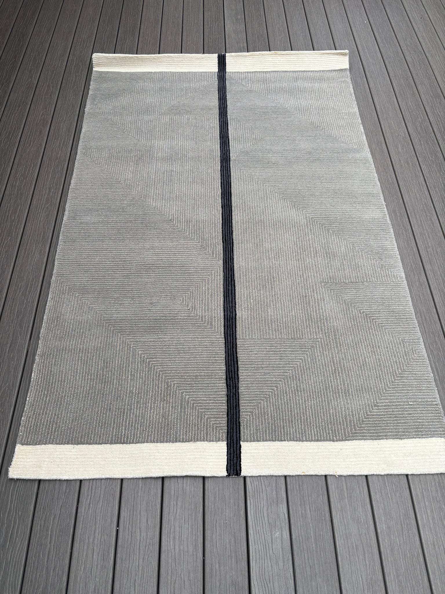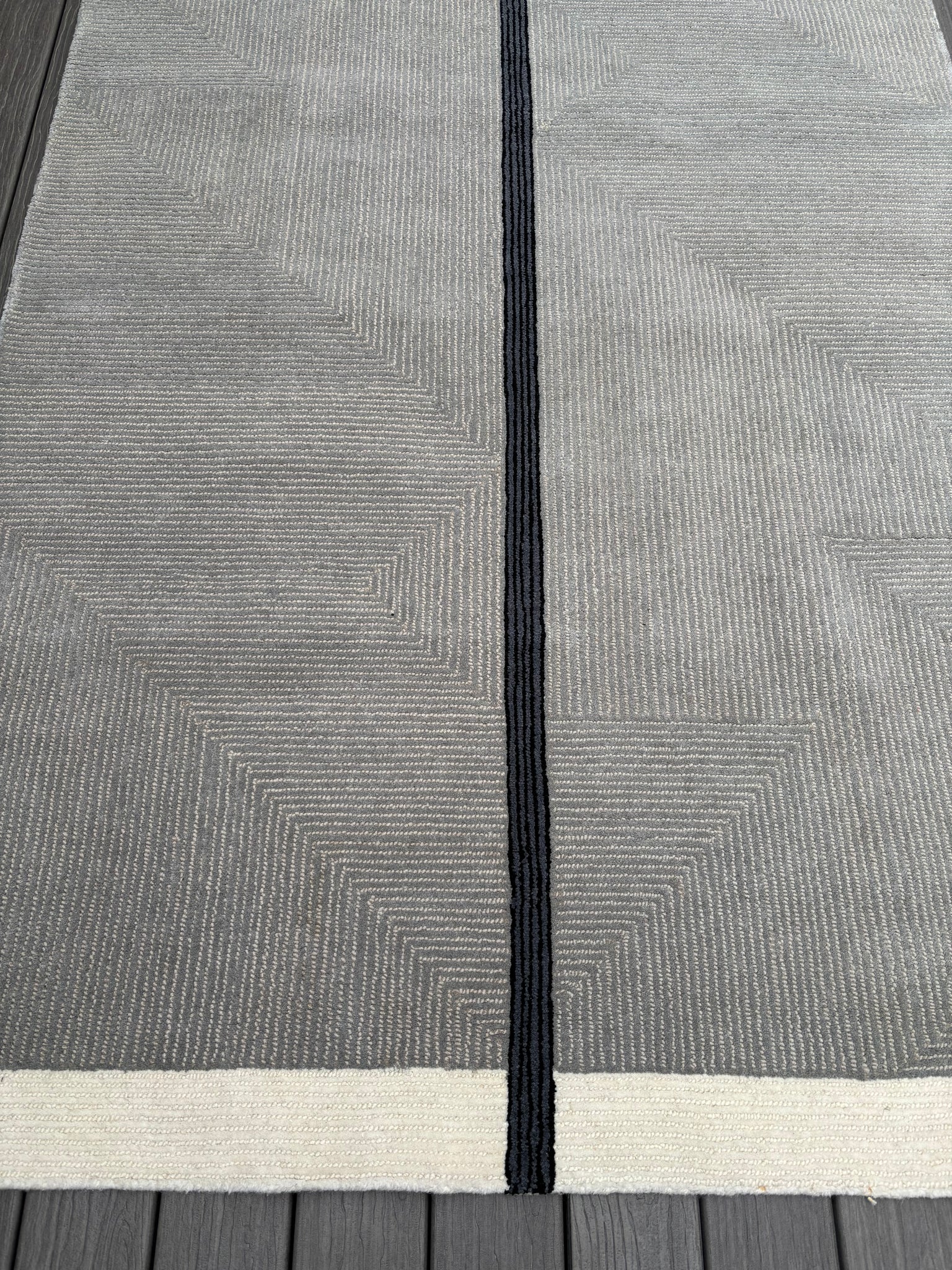 Hand-tufted in India of wool blend, the collection features striking geometric patterns and high-contrast colors. The graphic element woven into the area rug brings a bold and modern feel to any room. The wool allows for stain, water, and fade resistance. The fiber of the rug allows easy care, can handle high traffic, and is pet friendly. This conversation starting piece will look great in any space you might host in.