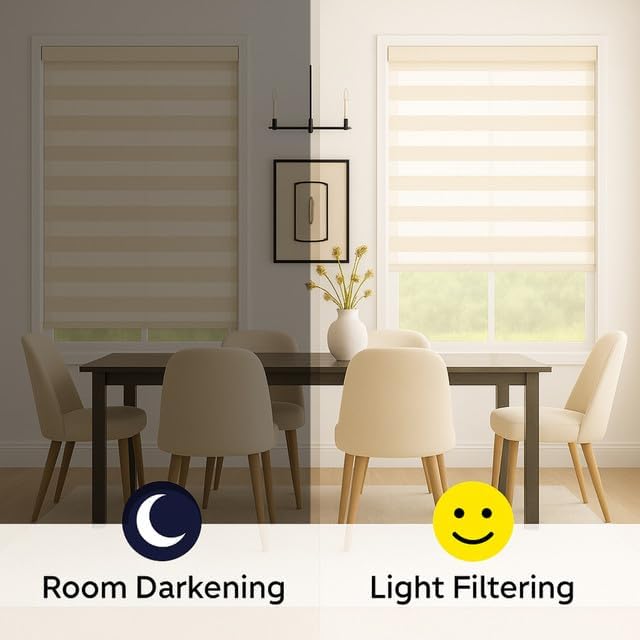 【Modern Zebra Blinds for Indoor Windows】 Add a sleek, modern look with zebra roller shades that combine style and function. These light filtering blinds for indoor windows feature alternating sheer & opaque fabric bands, giving full control over brightness and privacy. Perfect window blinds for home, bedrooms, living rooms, kitchens, and offices—ideal for anyone seeking versatile day and night shades.